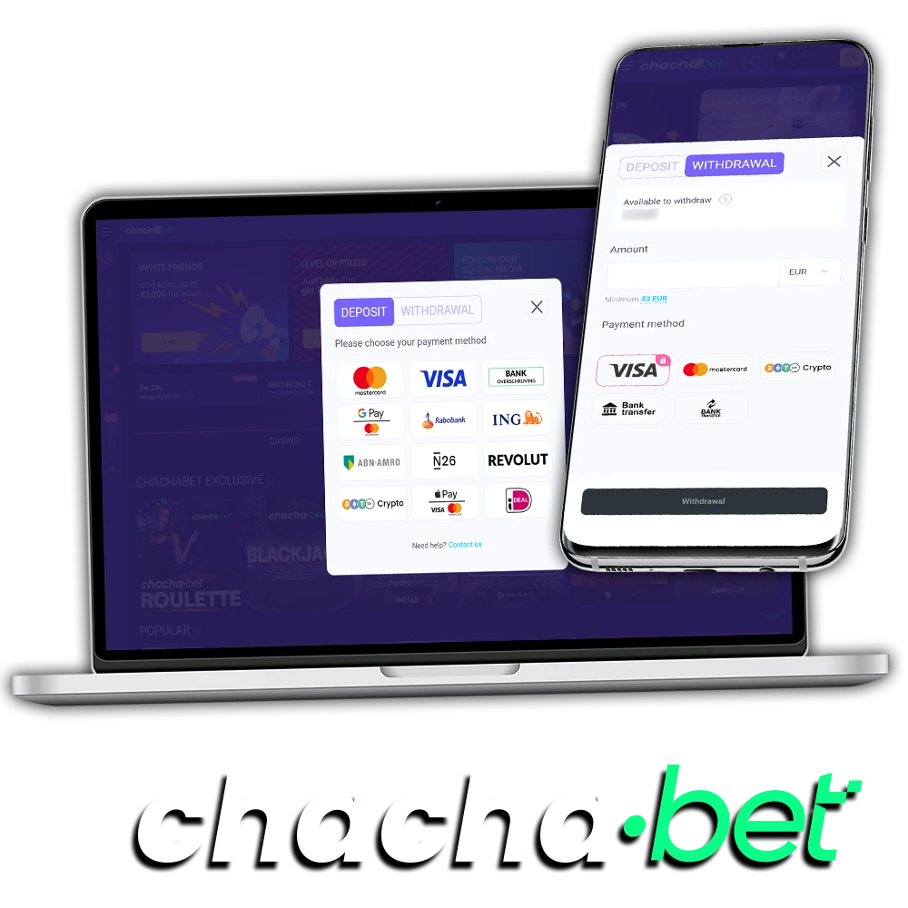Chachabet biedt Nederlandse spelers een breed scala aan stortingsmethoden zonder commissie. Het minimale stortingsbedrag is €10 en het maximale stortingsbedrag is €10.000, waarbij de meeste betalingen direct worden bijgeschreven.