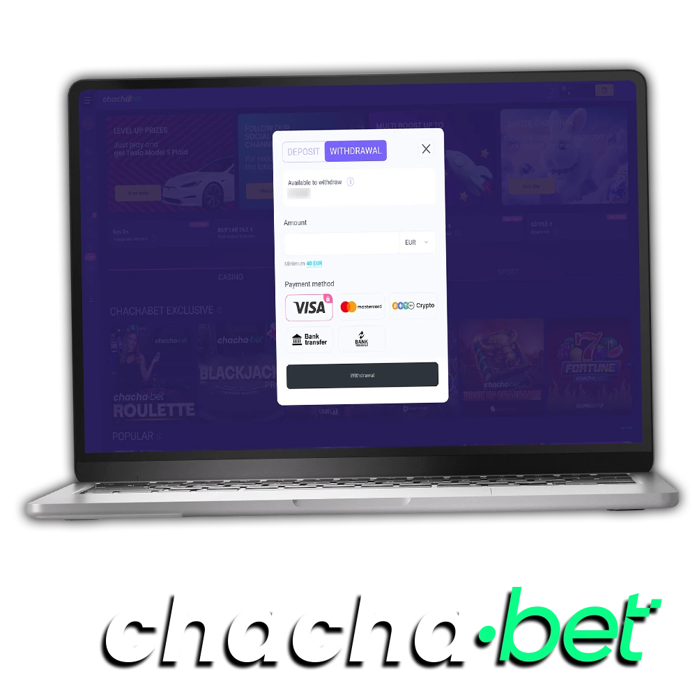Chachabet biedt spelers in Nederland meerdere betrouwbare opnamemethoden, waaronder VISA, Mastercard, Maestro en populaire e-wallets zoals Skrill, Neteller en MuchBetter. Het minimale opnamebedrag begint bij €10, terwijl het maximale opnamebedrag kan oplopen tot €50.000 per transactie. Uitbetalingen worden doorgaans verwerkt binnen 0 tot 3 werkdagen, afhankelijk van de gekozen betaalmethode. Nieuwe spelers kunnen bovendien profiteren van een welkomstbonus tot €10.000 + 800 gratis spins bij de eerste storting.